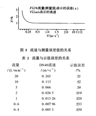 由EMF的測(cè)量原理可知,其流量的下限由同噪聲或偏移的信噪比S/N 來(lái)決定,其上限則由測(cè)量管內(nèi)襯里的磨損和配管的經(jīng)濟(jì)速度等來(lái)決定。一般當(dāng)測(cè)量管內(nèi)實(shí)際流速小于0.1m/s時(shí),感應(yīng)電動(dòng)勢(shì)已變得十分微弱(幾微伏至零點(diǎn)幾微伏),此時(shí)噪聲的影響逐步變?yōu)橹鲗?dǎo),甚至淹沒(méi)信號(hào)電動(dòng)勢(shì)。其流速和測(cè)量誤差的關(guān)系詳見(jiàn)圖 5和表2。