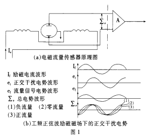 工頻干擾噪聲是由電磁流量傳感器勵磁繞組和流體、電極、放大器輸入回路的電磁耦合,其二是污水流量計工作現(xiàn)場的工頻共模干擾,其三是供電電源引入的工頻串模干擾等,其產(chǎn)生的物理機(jī)理均是電磁感應(yīng)原理。*先就電磁流量傳感器勵磁繞組和流體、電極、放大器輸入回路的電磁耦合產(chǎn)生的工頻干擾對污水流量計工作影響*大,而且在不同的勵磁技術(shù)下其表現(xiàn)的形態(tài)、特性不同,因而采取抗干擾措施也不同,電磁流量傳感器原理見圖1(a) 。在工頻正弦波勵磁磁場下,此種電磁耦合工頻干擾噪聲表現(xiàn)形式為正交干擾(見圖1b),又稱為變壓器電勢,其特點是干擾噪聲幅值和工頻正弦波勵磁頻率成正比,相位滯后流量信號電勢90°,且幅值較流量信號電勢大幾個數(shù)量級。