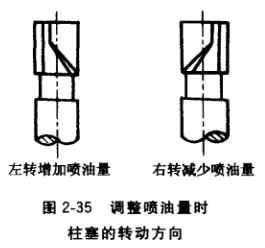 噴油量不均勻調(diào)整時,可將調(diào)節(jié)齒桿移到停止供油的位罝。用小螺絲刀旋松調(diào)節(jié)齒輪上 的鎖緊螺釘?再用小螺絲刀頭觸在油雖控制套筒的小孔中,用小手錘輕輕地敲擊螺絲刀柄, 若噴油量過小,使控制套筒向左轉(zhuǎn)一定角度;噴油最過大,使控制套筒向右轉(zhuǎn)一定角度。轉(zhuǎn)動控制套筒來調(diào)整噴油量大小時.應(yīng)根據(jù)其構(gòu)造確定轉(zhuǎn)動方向,如圖2-35所示。調(diào)整完成 后,再做試驗(yàn)進(jìn)行復(fù)驗(yàn),各缸噴油量應(yīng)接近一致為止。