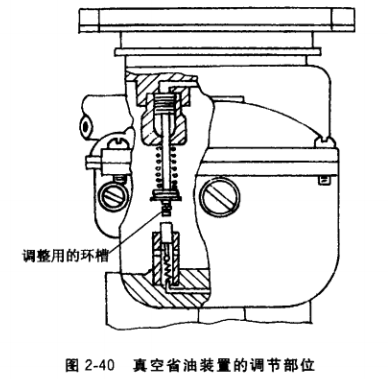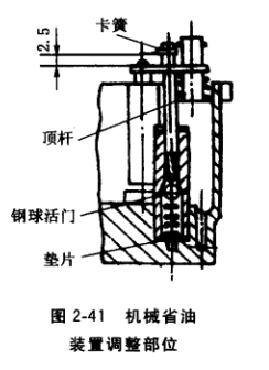 (4) 省油裝置的維修。231型汽化器裝有真空省油裝置和機(jī)械省油裝罝。真空省油裝置靠真空控制,可借活塞杠桿下端3道環(huán)梢加以調(diào)節(jié),如圖2-40所示。向下調(diào)節(jié)一個環(huán)槽,