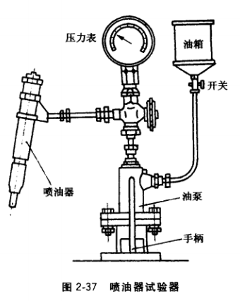 (1) 噴油器的調(diào)整。在檢查、調(diào)整噴油器時,應(yīng)在試驗(yàn)器上進(jìn)行,如圖2-37所示。