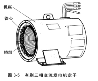 (1)定子。定子由機座、定子鐵心、定子繞組組 成,如圖3-5所示。機座是發電機的整體支架,用以固定帶繞組的定子鐵心,并和前端蓋、后端蓋及軸承一道支承轉子。新型發電機機座由鋼板壓制而成,機座內壁有沿圓周均勻分布的若干軸向筋條,用以支撐、 固定定子鐵心。機座兩端面加工有與端蓋配合的止口及螺孔。機座下部有支撐定子及整機的底腳。機座頂 部或側面一般裝有出線盒,出線盒內裝有接線板,從這里接出交流電輸出引線、勵磁繞組引線和定子副繞組引線。有的發電機出線盒中裝有勵磁調節器。