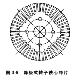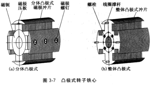 中小型交流發電機不論是單 相還是三相,其磁極鐵心都可分為凸極式和隱極式兩種結構。凸 極式指磁極鐵心每極的極身呈凸起狀,磁極繞組就套裝在極身上或直接繞制在絕緣極身上。凸極式磁極鐵心有分體凸極式和鋃 體凸極式之分,它由如圖3-7所示的凸極式磁極鐵心沖片疊裝而成,圖3-7a為分體凸極式磁極鐵心,每個極鐵心套裝上磁極繞組后,用磁極螺釘固定在磁軛上;圖3-7b為整體凸極式磁極鐵心,每個極與磁軛部分為一體,磁極繞組直接繞制在已包扎好絕緣物的極身上。國外引進技術生產的發電機都采用整體凸極式結構,其磁極繞組散熱條件好,機械強度高,轉子無第二氣隙,減少了勵磁安匝,而且阻尼繞組布置方便,斜極方便,可用斜極結構消除齒諧波。