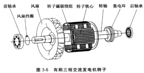(2) 轉子。轉子一般由轉軸、磁極鐵心、磁極繞組、集電環、軸承及風扇等組成,如圖 3-6所示。