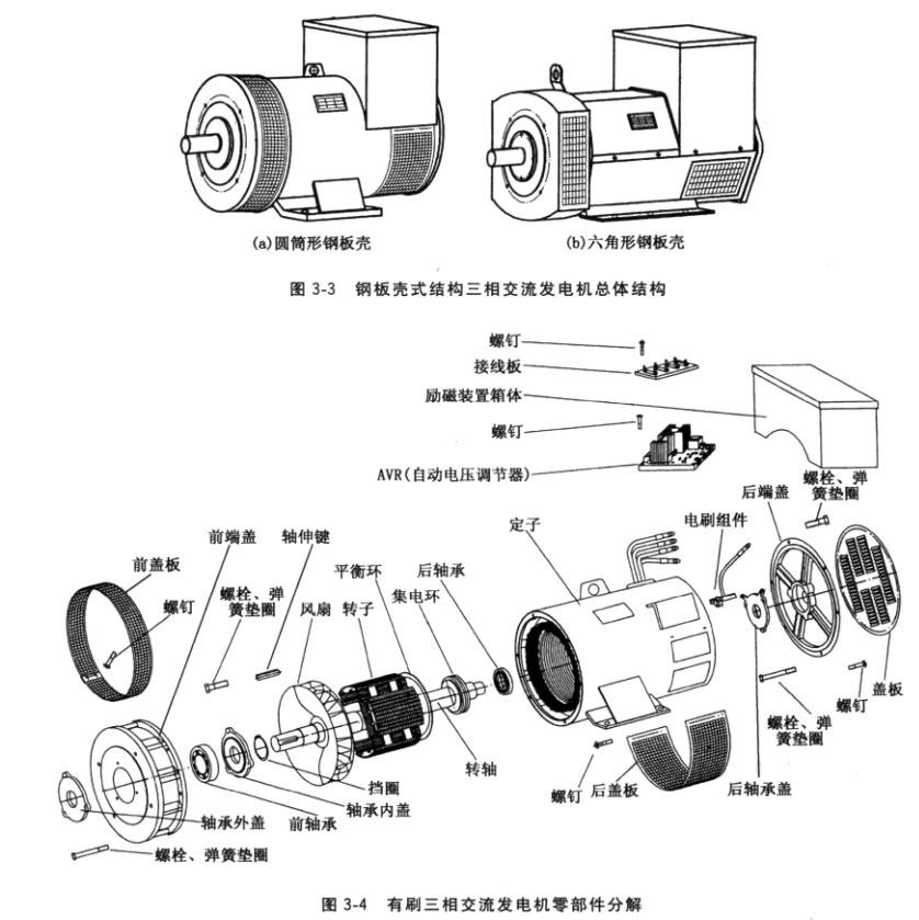 國外交流發電機總體結構兒乎都是鋼板殼式,我國目前自主開發的由柴油機或汽油機驅動的中小型三相交流發電機總體結構,也越來越多采用鋼板殼式,如圖3-3所示。有刷三相交流發電機主要由定子、轉子、端蓋、軸承、出線盒等組成,其主耍零部件如圖3-4所示。