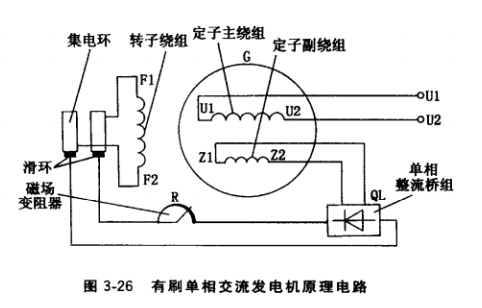 有刷單相交流發(fā)電機原理電路如圖3-26所示。由勵磁電源輸出的直流電(勵磁電源一 般來自定子副繞組感應的交流電經(jīng)整流成的直流電)向轉(zhuǎn)子磁極繞組提供勵磁電流。發(fā)電機由內(nèi)燃機驅(qū)動至空載轉(zhuǎn)速,依靠轉(zhuǎn)子磁極鐵心的剩磁磁場(新機或經(jīng)大修的舊機須經(jīng)充磁后,磁極鐵心才有剩磁磁場),在定子繞組中感應出交流電,由于定子梢中嵌人的繞組是單相繞組,因而感應的是單相交流電壓。調(diào)節(jié)磁場變阻器或自動電壓調(diào)節(jié)裝置的電位器,可使發(fā)電機空載電壓整定在額定電壓值。