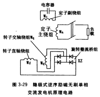 隱極式逆序勵磁無刷單相交流發電機整機原理電路如圖3-29所示。圖中定子主繞組Wa 經負荷開關接負載,定子副繞組Wc外接交流電容器。轉子交軸繞組Wq接單相旋轉整流橋組XZ的交流側,轉子直軸繞組Wd接直流側。