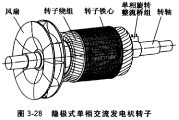 (2) 轉子。包括風扇、轉子鐵心、轉子繞組、單相旋轉整流橋組、軸承。轉子外形如圖 3-28所示。其風扇、軸承與有刷單相交流發電機基本一樣,這里不作介紹。