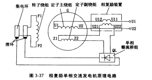 相復勵單相發電機原理電路 如圖3-37所示。發電機由發動機驅動至額定轉速附近時,依靠轉子鐵心剩磁磁場,定子副繞組感應的電壓經電抗變流器二次繞組的移相作用,提供建立發電機空載電壓的交流勵磁電流的電壓分量,經單相整流橋組整流后,向發電機轉子繞組提供空載勵磁電流,發電機很快自勵建立空載電壓。
