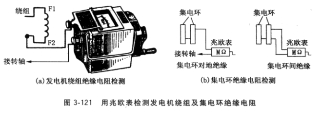 兆歐表的2個(gè)接線柱經(jīng)絕緣導(dǎo)線分別與集電環(huán)的2個(gè)銅環(huán)相接,見圖3-121b (右),手搖兆歐表手把,即測(cè)得2個(gè)銅環(huán)間的絕緣電阻。
