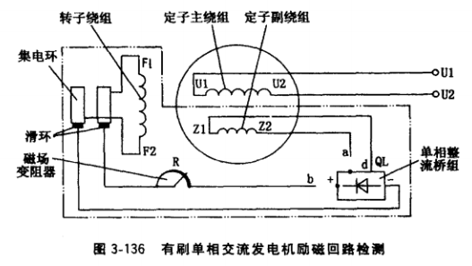 圖3-136雙點劃線框內的部分是這種發電機勵磁回路,包含定子副繞組Z1Z2、單相整流橋組QL、磁場變阻器R、集電環、轉子繞組F1F2及各段連接線。檢測前先拆開單相整流橋組交、直流側各一個接點,然后按以下順序檢測: