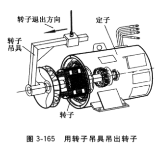 (4)退出轉子。用圖3-165所示吊具,套入轉子軸伸端,輕輕吊起轉子,沿箭頭方向緩緩退出轉子。不須拆彈性聯軸器或盤式柔性聯接片的發電機轉子退出法:由人工邊轉動轉子邊軸向退出轉子,當轉子鐵心段剛露出定子機座時,用粗麻繩圈套鐵心外徑,輕輕吊起轉 子,緩緩退出轉子。不管采用以上哪種方法,退出轉子過程切不可碰傷定子繞組。退出轉子后如圖3-166所示,仍由吊具吊運轉子然后輕放在干凈、可靠的臺架上。
