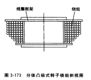 單、三相交流發電機凸極轉子繞組有兩種結構形式:分體凸極式鐵心磁極繞組,其剖視如圖3-173所示,包括線圈框架和漆包線繞組;整體凸極式鐵心磁極繞組,其剖視如圖 3-174所示,包括磁極鐵心極身絕緣和漆包線繞組。