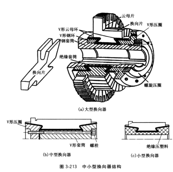 換向器結構如圖3-213所示。圖a為大型換向器結構,用螺旋壓圈鎖緊。圖b為中型換向器結構,靠圓周均勻分布的3個軸向螺栓鎖緊。圖c為小型換向器結構,采用絕 緣壓塑料成型。