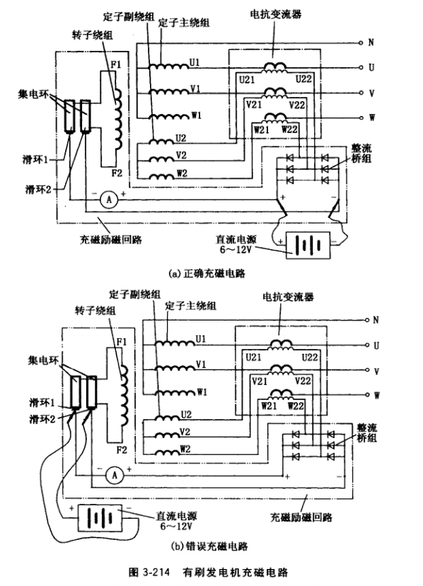 (2)兩種錯誤充磁方法。一是直流電源“+”極觸電刷、滑環2, “-” 極觸電刷、滑環1,見圖3-214b,此時直流電流表表針正向偏擺,若發電機有旋轉,交流電壓表指示電壓上升,但充磁電源一脫離,發電機就隨之失壓。因為在這種情況下,充磁電源所激勵的勵磁電流方向與整流橋組輸出的勵磁電流方向相反,不可能維持發電機勵磁電流;二是直流電源 “+”極觸整流橋組“-”端,“-”極觸整流橋組“+”端,則表現為勵磁電流表表針反偏,交流電壓表指示電壓上升,但充磁電磁一脫離,發電機隨之失壓。因為在這種情況下, 充磁電源所激勵的勵磁電流方向也與整流橋組輸出的勵磁電流方向相反,不可能維持發電機勵磁電流。