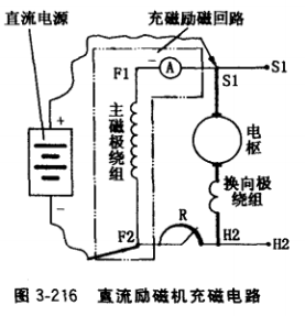 圖3-216中雙點劃線范圍為充磁勵磁回路,包括直流直 流電源 充磁勵磁回路電流表“ + ”端、“-”端、定子主磁極繞組。充磁前勵磁機充磁勵磁電路應完好,勵磁機處于停機或運轉狀態。6?12V直流電源“+”極觸直流電流表“+”端,“-”極觸定子主磁極繞組“F2” 端,此時直流電流表表針正向偏轉,說明定子主磁極繞組中有直流電流通過,完成充磁工作,即可脫離直流電源。有的勵磁機未裝勵磁電流表,且試驗臺上也未裝勵磁電流表,則最好在勵磁機旋轉情況下充磁,觀察交流電壓表有電壓指示,且脫離充磁電源后勵磁機能維持電壓,即完成充磁。若充磁直流電源“ +”、“-”極與定子繞組“F1”、“F2” 反接時,則直流電流表表針反向偏轉,電樞感應的電壓極性隨之改變,也就是勵磁機輸出電壓的“ +”、“-”端改變,影響勵磁機正常使用。