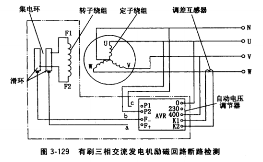 ②無勵磁電流。有刷三相交流發電機勵磁回路包含U相定子繞組、AVR或整流橋組、 集電環、轉子繞組F1F2及各段連接線(詳見圖3-129中雙點畫線框內電路)。當該回路斷線 或電氣接觸嚴重不良(如接線頭氧化、松脫,變阻器接線螺栓松動等)時,發電機無勵磁電流。
