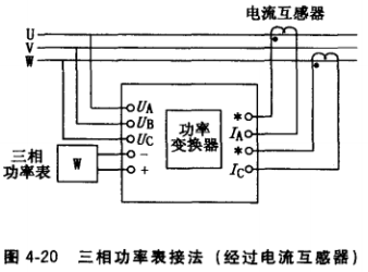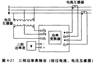 (3)接入三相功率表的三相電壓和電流均經互感器,再接至功率變換器.如圖4-21所 示。這種接法只要配上不同變比的電壓、電流互感器,可測任何電壓、電流下的功率。