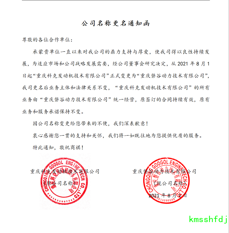重慶科克發動機技術有限公司更名重慶磐谷動力技術有限公司 通知