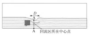 來自上游的水體經(jīng)浮體結(jié)構(gòu)的阻擋作用,水流繞流經(jīng)浮體結(jié)構(gòu)的上部和下部區(qū)域通過,并在浮體結(jié)構(gòu)背水面的下游區(qū)域形成小范圍回流區(qū),此處水流紊亂,流速分布不均勻。試驗過程中,對回流區(qū)沿水流方向的長度D(水槽縱向中心斷面處,自浮體結(jié)構(gòu)背水面到沿水流方向流速為0的*遠位置點)進行量測。選取浮體結(jié)構(gòu)下游區(qū)域回流區(qū)中心點所在斷面進行流速測量對比。流速測量斷面位置A-A見圖3。