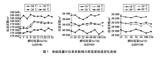 由圖1可得:( 1)隨著介質(zhì)溫度的升高,給排水流量計(jì)的儀表系數(shù)均呈逐漸降低的趨勢(shì)。其中20℃和50℃的儀表系數(shù)基本相同,10℃和80 0C的儀表系數(shù)與20℃時(shí)偏離較大。(2)溫度對(duì)給排水流量計(jì)的儀表系數(shù)在高溫以及低溫處影響明顯,以D N40給排水流量計(jì)為例,儀表系數(shù)本次實(shí)驗(yàn)高低溫處*大變化量約為0. 7% o ( 3)在給排水流量計(jì)相應(yīng)的流量范圍內(nèi),在同一溫度下,隨著介質(zhì)流速的變化,給排水流量計(jì)的儀表系數(shù)在個(gè)別點(diǎn)出現(xiàn)略微浮動(dòng),但整體變化不超過(guò)1 0. 2 %。