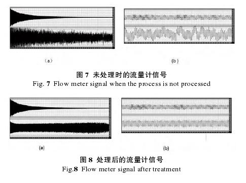 圖 7 為未處理時流量計(jì)輸出的傳感器信號和放大器輸出信號。圖 7(a)上部為傳感器輸出的原始信號,下部為放大器輸出信號;