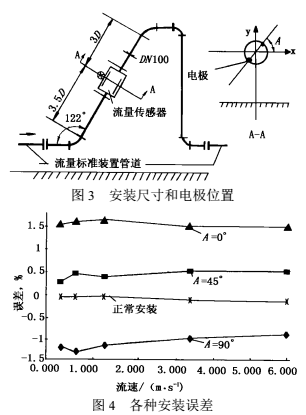 除儀表前直管段可降低彎管影響外,人們還從安裝方式上設(shè)法降低影響的方法。文獻(xiàn)曾報(bào)道電磁流量傳感器電極軸線與鄰近彎管平面成45°傾斜安裝可以減少彎管影響。日本工業(yè)標(biāo)準(zhǔn)B7554“解說部分”列有電極軸線與彎管平面垂直、平行、成45°三種安裝方式,在不同長度直管下的測(cè)量誤差范圍,也說明這一效果。