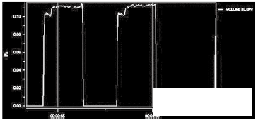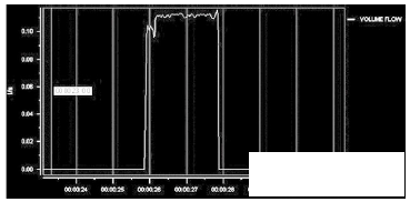 灌裝頭的*終出口部分為10~14mm的可更換縮口。通過縮口,可以產(chǎn)生背壓,一般縮口內(nèi)置蜂窩狀虹吸管,保證灌裝前后的管道滿管。從測(cè)試的流量波形上看,10mm的灌裝頭產(chǎn)生適當(dāng)?shù)淖枘嵝Ч髁壳€較穩(wěn)定。