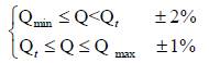 由圖2 可見,儀表系數(shù)可分為二段,即線性段和非線性段。在非線性段, 實際特性受軸承摩擦力、流體粘性阻力影響較大。當流量低于Qmin 時,儀表系數(shù)隨著流量迅速變化。壓力損失與流量的平方成正比關(guān)系。通常線性段約為工作段的2/3,其特性與渦輪結(jié)構(gòu)參數(shù)及流體粘性有關(guān)。隨流量的變化其儀表系數(shù)K 也會有一定的變化,但變化不大,通常將其變化幅度稱為流量計的計量準確度。對于產(chǎn)品設(shè)計而言,期望能將線性段的流量范圍拓展,一臺流量計能覆蓋同口徑的不同流量范圍,使得產(chǎn)品量程比變寬從而降低生產(chǎn)管理與生產(chǎn)批量加工成本。對于1.0 級的高壓機油流量計,以Qt(0.2Qmax)為分界流量點,將計量線性分為兩段,其中一段的*大允許誤差為±2%,而另一段的*大允許誤差為±1% 。按圖2 所示,通常每臺渦輪流量計均有較為相似特性曲線,若將可測量流量范圍做寬,就能在同口徑不同流量范圍進行分段截取,以實現(xiàn)一臺流量計能覆蓋同口徑的不同流量范圍。