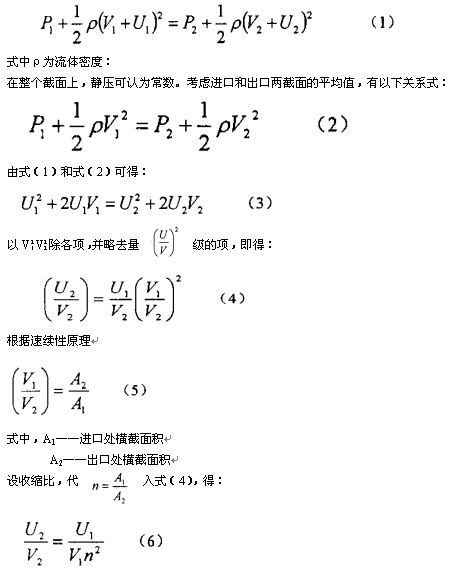 設(shè)整流器進(jìn)口處壓力為P1,平均流速為V1,某點(diǎn)上的速度不均勻度為U1,出口處壓力為P2,平均流速為V2,通過進(jìn)口處某點(diǎn)同**線,在出口處的速度不均勻度為U2,沿該流線,由伯努利方程得: