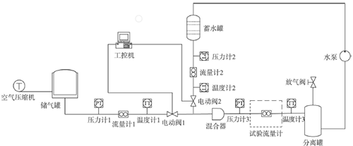 試驗介質(zhì)由已測定流量的水和空氣組成,分別送入管道混和成氣液兩相流送入試驗管段。試驗裝置如圖1所示。試驗裝置由空氣壓縮機、儲氣罐、蓄水罐、分離罐、流量計、壓力變送器、溫度變送器、工控機和各種閥門組成。