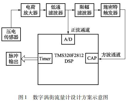 本文設(shè)計(jì)的基于 TMS320F2812 DSP 的數(shù)字二氧化碳流量計(jì)的信號(hào)處理系統(tǒng)由前置放大電路和數(shù)字信號(hào)處理電路兩部分組成。本文選用的前置放大電路即為目前被廣泛應(yīng)用的普通二氧化碳流量計(jì)的前置放大電路,主要由電荷放大電路、低通濾波電路、限幅濾波電路和施密特觸發(fā)電路組成; 對(duì)于經(jīng)壓電傳感器測(cè)得的渦街信號(hào)采用了頻域分析和時(shí)域分析相結(jié)合的方式,即由前置放大電路和數(shù)字信號(hào)處理電路相配合。時(shí)域分析通道利用 DSP 事件管理器的捕獲模塊,對(duì)前置放大電路輸出的方波進(jìn)行頻率計(jì)算,然后再由 DSP 事件管理器通用定時(shí)器的比較輸出模塊進(jìn)行脈沖輸出。頻域分析通道即 DSP對(duì)低通濾波電路輸出的疊加了許多噪聲的正弦信號(hào)進(jìn)行 A/D 采樣,再利用 DSP 對(duì) A/D 采樣的結(jié)果進(jìn)行頻譜分析,從而得出此時(shí)渦街信號(hào)的頻率,*后由 DSP 通用定時(shí)器的比較輸出模塊進(jìn)行脈沖輸出。系統(tǒng)設(shè)計(jì)方案示意圖如圖 1 所示。