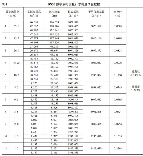 將本文實(shí)現(xiàn)的數(shù)字二氧化碳流量計(jì)在上述 50mm 口 徑( 簡(jiǎn)稱 DN50) 的水流量試驗(yàn)裝置上進(jìn)行試驗(yàn)。先在其正常流量范圍內(nèi)進(jìn)行試驗(yàn),流量從大到小逐漸降低,之后不斷探求其所能測(cè)量的*小流量。每個(gè)流量點(diǎn)試驗(yàn)三次,計(jì)算其重復(fù)性、平均儀表系數(shù)和線性度。水流量試驗(yàn)數(shù)據(jù)如表 1 所示。