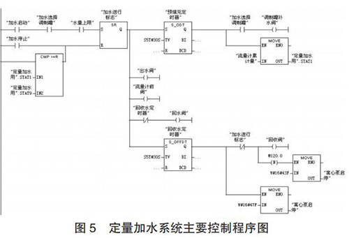 定量加水系統(tǒng)的工作過(guò)程為:當(dāng)設(shè)定好加水量后,啟動(dòng)系統(tǒng),多級(jí)離心泵 10、回流閥 4、出水閥 9 和流量計(jì)前閥 12開啟對(duì)管路進(jìn)行預(yù)填充;延時(shí) 30s 預(yù)填充完成后,回流閥 4關(guān)閉,調(diào)制罐補(bǔ)水閥 14 開啟,同時(shí)質(zhì)量流量計(jì) 13 開始計(jì)量;當(dāng)質(zhì)量流量計(jì)的累積量與設(shè)定加水量一致時(shí),出水閥 9 和調(diào)制罐補(bǔ)水閥 14 關(guān)閉;調(diào)制罐定量加水完成后,開啟回收閥17 和回流閥 4 以及同未關(guān)閉流量計(jì)前閥 12 一起,利用壓縮空氣對(duì)管道中水實(shí)現(xiàn)回收;延時(shí) 30s 水回收完成后,關(guān)閉多級(jí)離心泵、球閥 4、12 和 17,定量加水過(guò)程完成。定量加水系統(tǒng)主要控制程序如圖 5 所示。