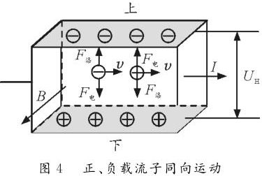情形2:正、負載流子反向運動。如圖3所示,長方體玻璃水槽中盛有NaCl的水溶液,水槽左、右側(cè)壁內(nèi)側(cè)各裝一導體片,在溶液中通入水平向右的電流,勻強磁場B垂直紙面向外。NaCl溶液中既有正離子,又有負離子,根據(jù)左手定則可判斷正離子受到向下的洛倫茲力,故向下運動并堆積。同理,負離子也受到指向下的洛倫茲力,也向下運動并堆積。由于正負離子均向下側(cè)面堆積,故上下兩側(cè)面的電勢均為零,但下側(cè)面處離子濃度大于上側(cè)面離子濃度。