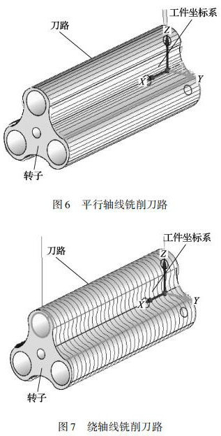 三葉轉(zhuǎn)子的曲面是由多條直線組成的直紋面,加工三葉轉(zhuǎn)子這種高精度的直紋曲面必須采用四軸或五軸聯(lián)動的數(shù)控機(jī)床。三葉轉(zhuǎn)子的銑削方式有刀具路徑平行軸線銑削、繞軸線銑削兩種刀具路徑。平行軸線銑削原理為: 刀具在轉(zhuǎn)子曲面上沿 X軸從轉(zhuǎn)子的一端移動到另一端銑出一條直線,銑削下一點位時旋轉(zhuǎn) A 軸 Z 軸聯(lián)動再次從轉(zhuǎn)子一端銑削到另一端,采用往復(fù)銑削直到完成整個轉(zhuǎn)子曲面,刀具路徑如圖 6 所示。繞軸線銑削原理為: 刀具在轉(zhuǎn)子曲面上 AZ 軸聯(lián)動刀具繞 A 軸軸線銑削,銑削下一點位時移動 X 軸,再次 AZ 軸進(jìn)行聯(lián)動銑削,采用往復(fù)銑削直到完成整個轉(zhuǎn)子曲面,刀具路徑如圖 7 所示。由于繞軸銑削需要 AZ 軸聯(lián)動切削,而數(shù)控機(jī)床可以達(dá)到的進(jìn)給率是由*慢的軸決定的,所以,這種刀具路徑在精加工高速銑削時并不適用。