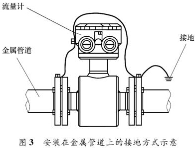 智能型防腐電磁流量計安裝在金屬管道上,安裝時將金屬管道與智能型防腐電磁流量計相連接,接地線再接入接地網(wǎng),如圖 3 所示。