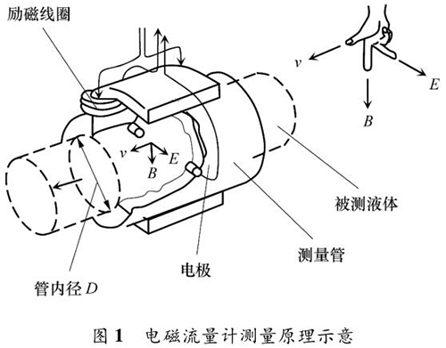智能型防腐電磁流量計的測量原理如圖 1 所示。根據(jù)法拉*電磁感應(yīng)定律,導(dǎo)電液體在磁場中流動會產(chǎn)生電動勢 E,它與磁感應(yīng)強度 B、導(dǎo)電液體平均流速 v 成一定比例關(guān)系: