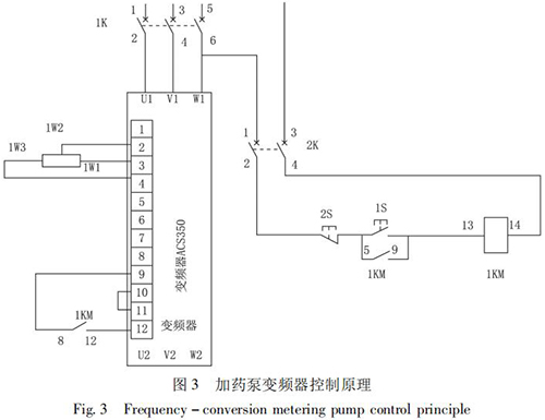 STD - Ⅲ型浮選工藝參數(shù)自動(dòng)測(cè)控系統(tǒng)通過雙膜盒差壓計(jì)測(cè)量原礦漿濃度; 采用插入式電磁流量計(jì)測(cè)量原礦漿流量,由 PLC 計(jì)算出入浮干煤泥量和藥劑的瞬時(shí)添加量,用變頻式計(jì)量泵完成浮選藥劑的添加。通過上位機(jī)還可以打印小時(shí)、班、天及月的運(yùn)行數(shù)據(jù),更加有利于生產(chǎn)管理及技術(shù)分析,藥劑自動(dòng)原理如圖 2 所示,k1、k2、k3 是計(jì)算修正參數(shù)。以 PID 算法為核心,通過優(yōu)化控制程序計(jì)算出藥劑給定量,在捕收劑和起泡劑管道上分別安裝藥劑測(cè)量裝置,用于檢測(cè)藥劑的添加量。當(dāng)藥劑測(cè)量值小于藥劑給定量時(shí),PID 輸出增大,反之則減小。加藥泵變頻器控制原理如圖 3 所示。