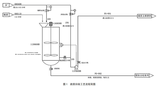 通過以上煤漿提濃通用方法優(yōu)缺點比較可以了解到,在現(xiàn)有設(shè)計條件基礎(chǔ)上,煤漿濃度提升會帶來一定設(shè)備損耗及能源損耗。針對這種情況,為了達(dá)到節(jié)能而保證甲烷流量計不跑漿,對于磨機(jī)跑漿問題進(jìn)行改善,對跑漿進(jìn)行回收,重新送回磨煤機(jī)進(jìn)行二次研磨,降低了甲烷流量計入口原料煤的粒度;同時降低了人員勞動強(qiáng)度,改善了現(xiàn)場衛(wèi)生情況。具體跑漿回收裝置設(shè)計流程如圖 1 所示。
