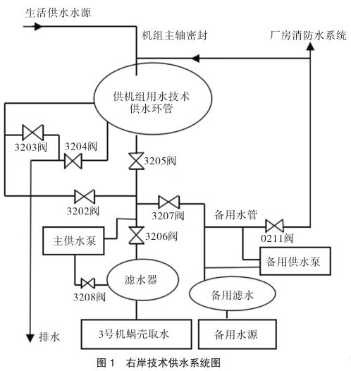 技術(shù)供水系統(tǒng)設(shè)有主、備用水源。主水源是蝸殼取水,作為機組技術(shù)供水的主用水源。備用水源有兩個,一個是設(shè)在 1 號機段的壩前取水,取水口高程為 145m,另一個是同 4 號機組蝸殼取水共用取水口的蝸殼備用取水。兩路備用水源均接到備用總水管,并通過 X207 閥分別與各臺機組的技術(shù)供水系統(tǒng)相連通(見圖 2)。