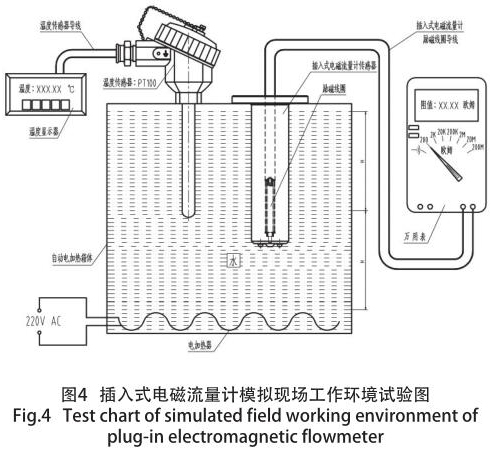 其原因是:勵(lì)磁線圈的阻值及匝數(shù)是按照常溫狀態(tài)下進(jìn)行設(shè)計(jì)的,而含有勵(lì)磁線圈的煤層注水流量計(jì)經(jīng)常是高于常溫狀態(tài)下進(jìn)行安裝、使用(如:高爐回水、供熱管道等),勵(lì)磁線圈的阻值隨使用環(huán)境溫度的變化而變化,致使煤層注水流量計(jì)測(cè)量時(shí)的準(zhǔn)確度大為降低,性能的不確定性大為增加,為了保證儀表的高準(zhǔn)確度和穩(wěn)定性,在不同的季節(jié)(主要是環(huán)境溫度和介質(zhì)溫度),經(jīng)過(guò)大量模擬現(xiàn)場(chǎng)實(shí)際情況的試驗(yàn),并結(jié)合轉(zhuǎn)換器的技術(shù)參數(shù)要求,得出一個(gè)完善的勵(lì)磁線圈各種技術(shù)參數(shù)。模擬現(xiàn)場(chǎng)試驗(yàn)裝置如圖 4 所示。