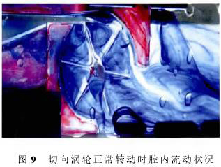 圖9記錄的是切向渦輪正常轉(zhuǎn)動時的流場,圖9中水從左向右流動,實驗時水速較快(1m3/d),渦輪葉片順時針轉(zhuǎn)動。水速變大后,擾動變大,不再是無旋繞角流動,腔體1中流體形成一個運動的旋渦,導致腔內(nèi)壓強分布不再對稱,產(chǎn)生壓差,致使渦輪葉片轉(zhuǎn)動,旋渦在隨葉片運動到腔體2中時逐漸耗散消失。數(shù)值仿真的計算結(jié)果與物理實驗的結(jié)果基本一致。