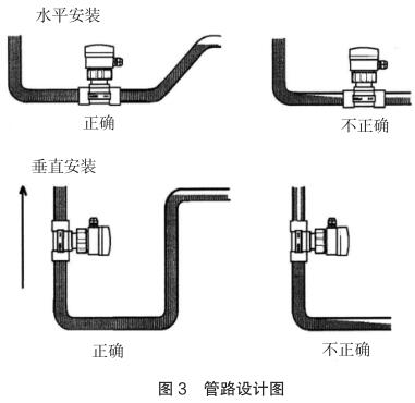 現(xiàn)場安裝時(shí)應(yīng)注意遠(yuǎn)離可能對其產(chǎn)生干擾的大型設(shè)備,防止長期的熱輻射和其他如磁場直射等環(huán)境影響。為確保高測量精度和較好的零點(diǎn)穩(wěn)定性,進(jìn)行校正前,智能型電磁流量計(jì)應(yīng)裝入工藝介質(zhì)中至少 24 小時(shí)電極鈍化。安裝的管路設(shè)計(jì)應(yīng)確保管道始終充滿流體,防止測量誤差,管路設(shè)計(jì)圖見圖 3。