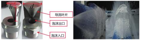 圖 1 為電弧風(fēng)扇噴嘴的結(jié)構(gòu)和噴霧,一種新型的噴嘴主要由一個過熱蒸汽渦街流量計(jì)入口、出口和導(dǎo)流葉片組成。出流口的圓柱形設(shè)計(jì)降低了湍流強(qiáng)度。導(dǎo)流葉片類似于流線型尾部,產(chǎn)生類似于弧形風(fēng)扇形狀的過熱蒸汽渦街流量計(jì)噴霧,其形狀類似于掘進(jìn)機(jī)的粉塵源。