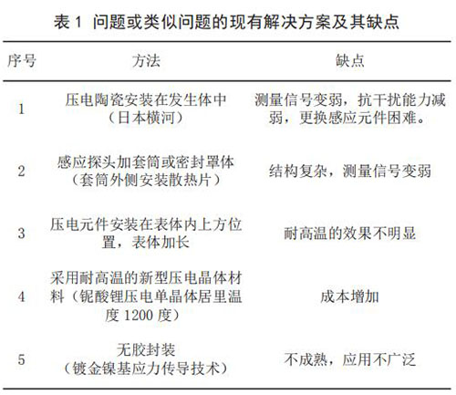 3) 當(dāng)前技術(shù)系統(tǒng)存在的問題。 由于目前使用的傳感器檢測感應(yīng)元件為壓電陶瓷,其極化時居里溫度大約420 ~ 460℃,因此只能在低于 240℃介質(zhì)中使用,一旦被測量介質(zhì)的溫度高于 240℃,煤氣流量計(jì)傳感器便會因壓電陶瓷達(dá)到居里點(diǎn),絕緣電阻降低,壓電信號變?nèi)醵А?br /> 4)問題或類似問題的現(xiàn)有解決方案及其缺點(diǎn)(見表 1)。