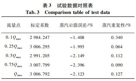 測試對象為同一臺表,DN80 口徑,帶有在空氣標定裝置上的 5 點標定系數(shù)。將管道介質(zhì)設(shè)定為過熱蒸汽,并預(yù)設(shè)溫度為 160 ℃ 和壓力 0. 4 MPa,以便儀表計算過熱蒸汽的密度。試驗數(shù)據(jù)對照如表 3 所示。
