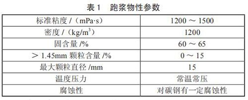 對跑漿進行分析后發(fā)現(xiàn),跑漿是一種由煤漿和一些雜質(zhì)混合而成的半流體物質(zhì),當(dāng)實驗室氣體流量計使用煤倉中煤堆中上部煤時,由于煤質(zhì)較好,跑漿中小煤塊極少,性質(zhì)同正常煤漿,只是固含量稍高;而使用煤堆底部的煤時,煤質(zhì)差實驗室氣體流量計研磨不充分,跑漿中含有約 15% 的小煤塊,分析后的跑漿物質(zhì)參數(shù)如表 1 所示。