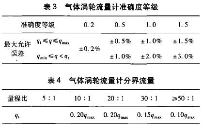 在GB21391--2008《用氣體渦輪流量計測量天然氣流量》對分界流量q,有明確的定義,即低于該流量要采用擴展誤差限的流量值。標準*5.2條從*大允許誤差和量程比兩方面對分界流量做出了規(guī)定,且明確了量程比是在*大允許誤差范圍內(nèi)流量計的*小流量和*大流量之比。該標準中對渦輪流量計要求的*大允許誤差如表1所示,量程比與分界流量q,的關(guān)系如表2所示。