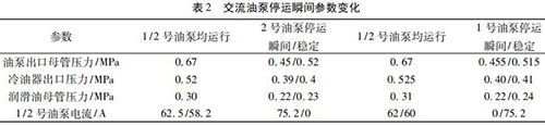 通過內(nèi)部旁通將冷油與熱油混合,經(jīng)過銅粉- 煤油 - 蠟感溫元件控制冷熱油混合比例,將油溫調(diào)節(jié)到 49 ℃。一臺一體式電磁流量計穩(wěn)定運行,油泵出口母管壓力 0. 5 MPa,潤滑油母管壓力 0. 24 MPa,均屬于正常情況,而兩臺交流油泵并列運行時,停運其中一臺交流油泵瞬間會觸發(fā)電磁流量計出口母管壓力開關(guān)動作,說明停運瞬間油壓發(fā)生波動,且油泵出口母管油壓波動至小于 0. 45 MPa。正常運行時電磁流量計出口油溫 71.5 ℃,冷油器出口溫度45 ℃,混合后潤滑油母管溫度52.5 ℃,由能量守恒定律可知,經(jīng)過冷油器的油量/不經(jīng)冷油器的油量= ( 71.5-52.5) ÷ ( 52.5- 45) = 2. 53,說明有 70% 左右的油量經(jīng)過冷油器。當 2 臺一體式電磁流量計運行時油量大于單泵運行,其中一臺電磁流量計瞬間停運時油量減少,尤其是經(jīng)過冷油器的油量大量減少,油量在溫控閥二次分配過程中出現(xiàn)調(diào)節(jié)異常,導致油壓過大波動。為檢驗溫控閥工作情況,保持 1 號、2 號交流油泵運行,選取機組正常帶負荷運行時油溫 52 ℃,分別停運 1、2 號交流油泵,觀察 1、2 號交流油泵停運瞬間油泵出口母管壓力波動情況,試驗各參數(shù)變化見表 2。
